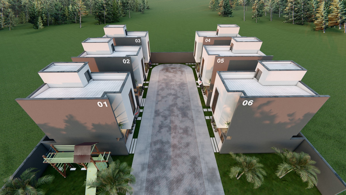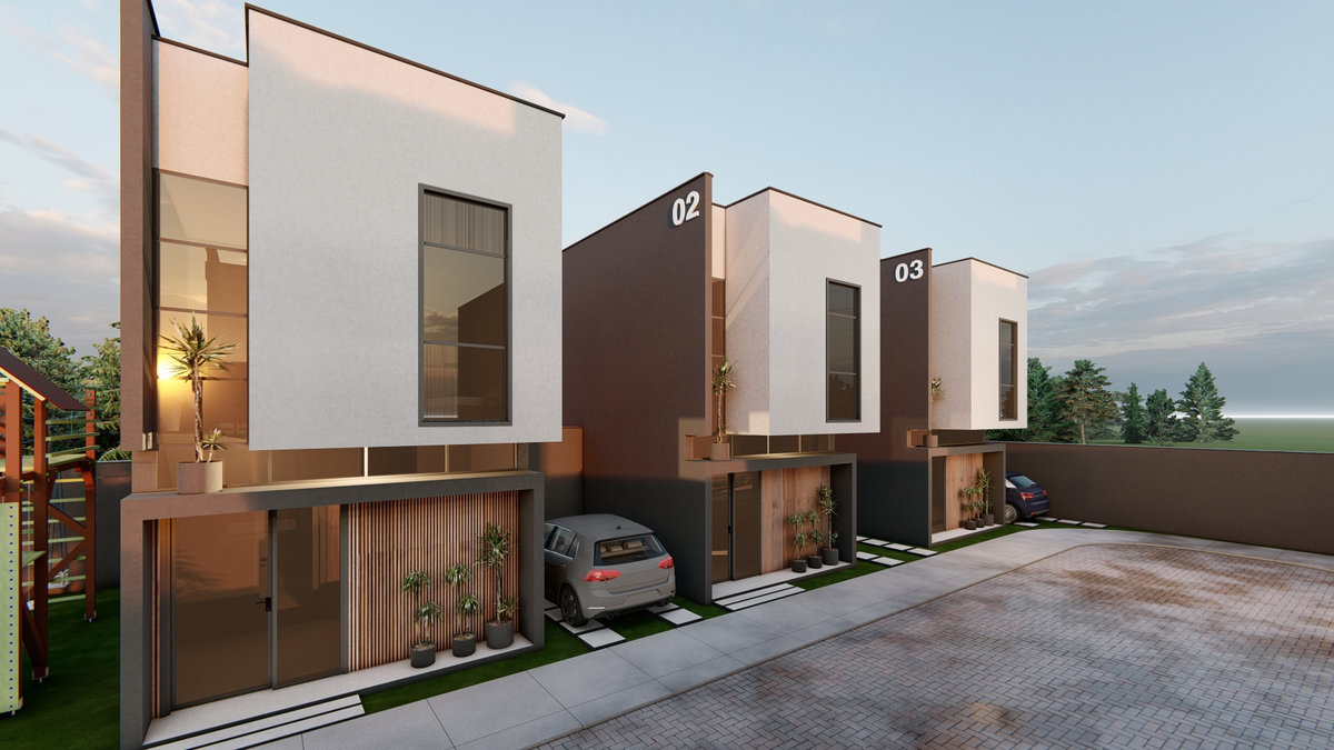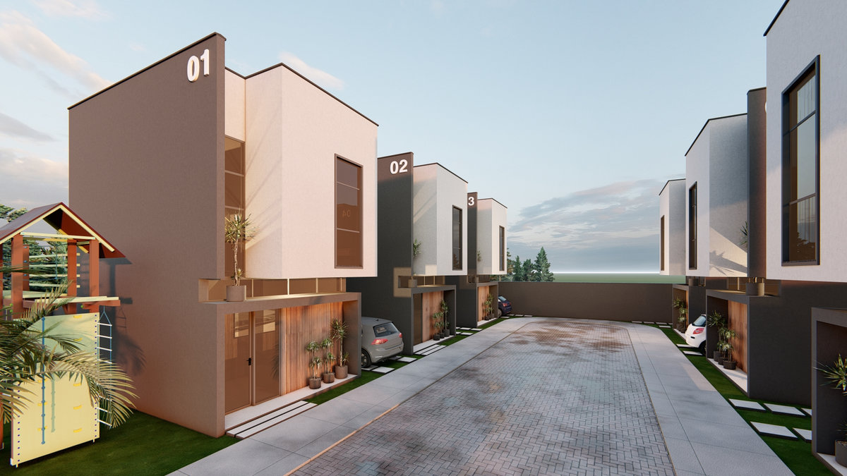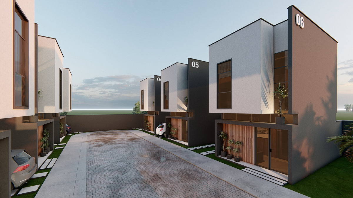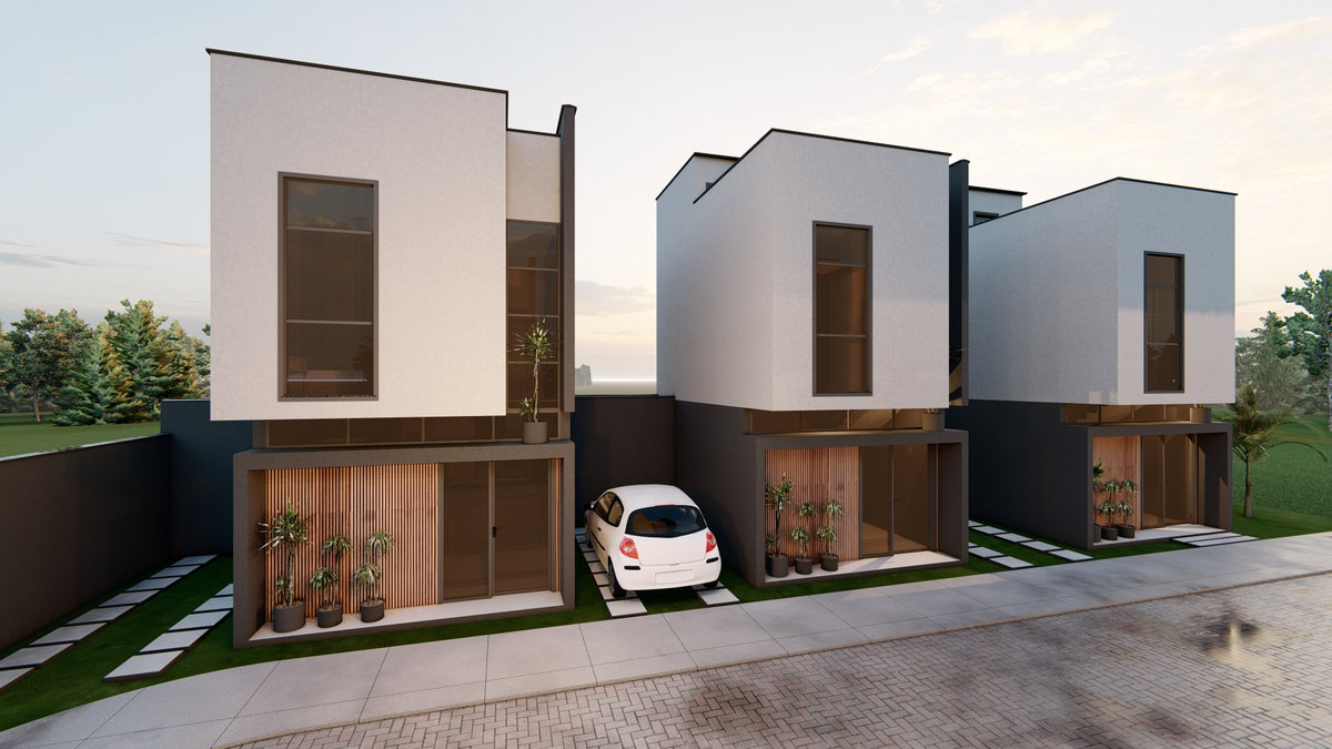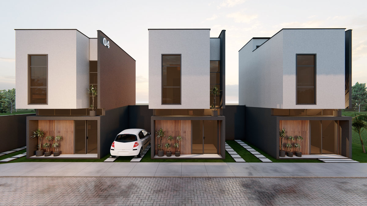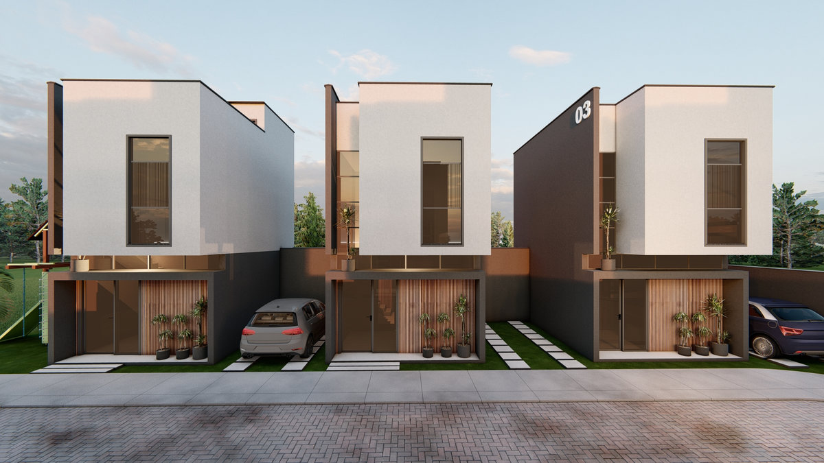 Casa Geminada Nandi I Conjunto de seis residências marcado por linhas retas, volumetria equilibrada e tons sóbrios. Esquadrias verticais e painéis ripados reforçam a estética contemporânea, traduzindo elegância discreta e harmonia entre proporção e luz natural.