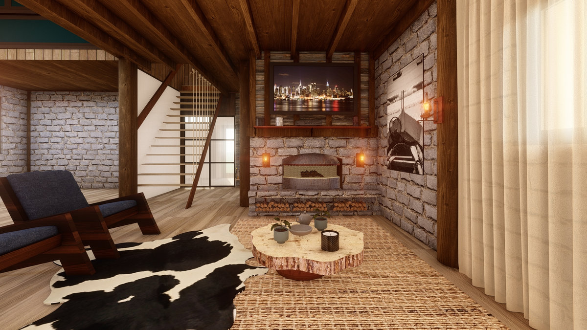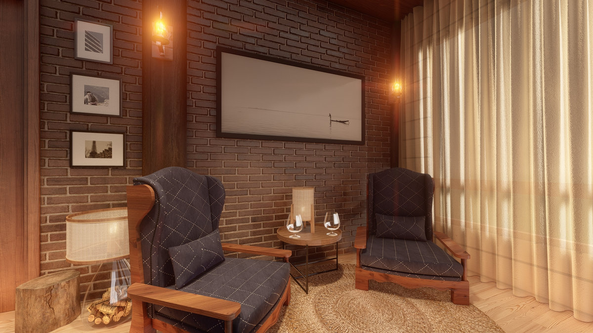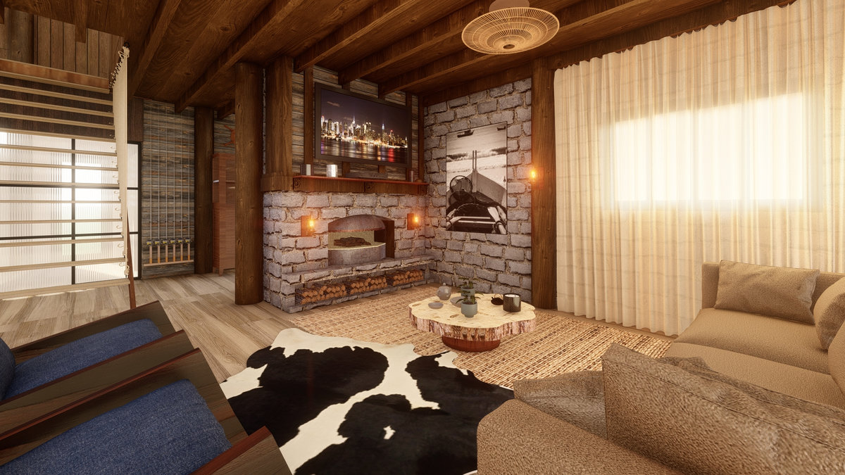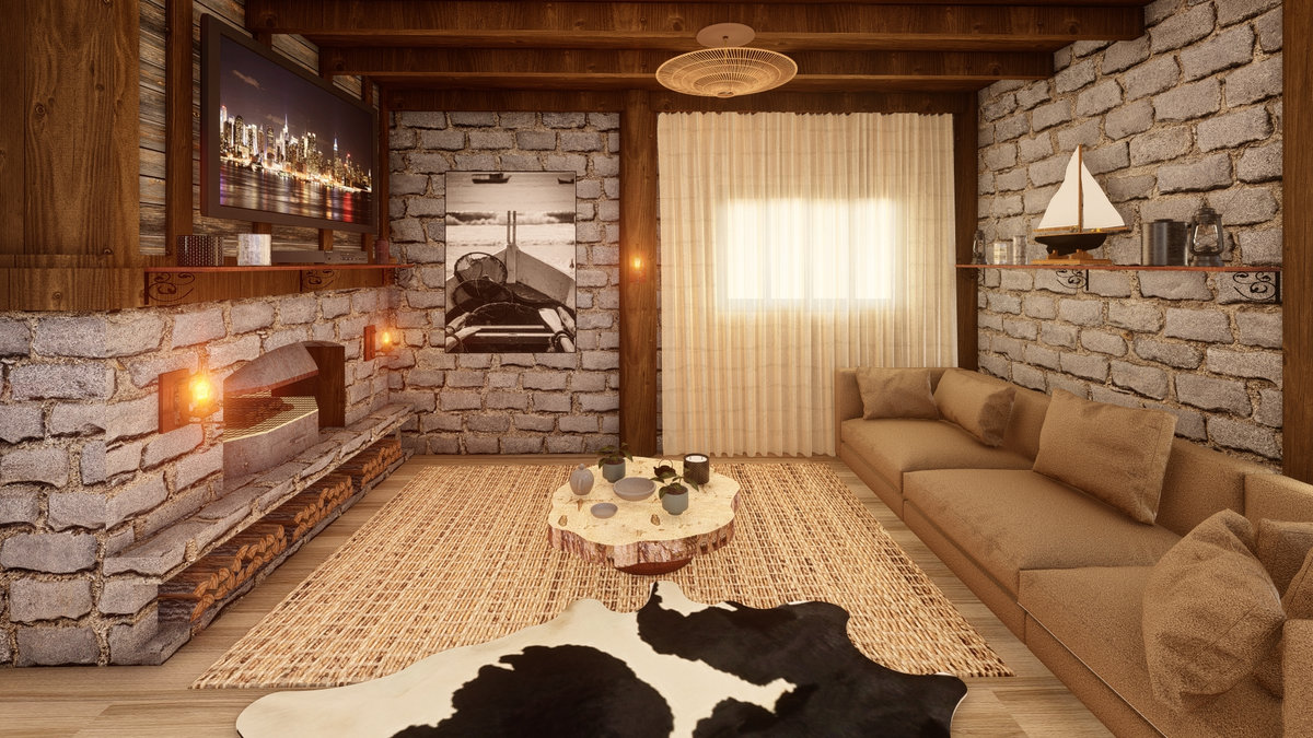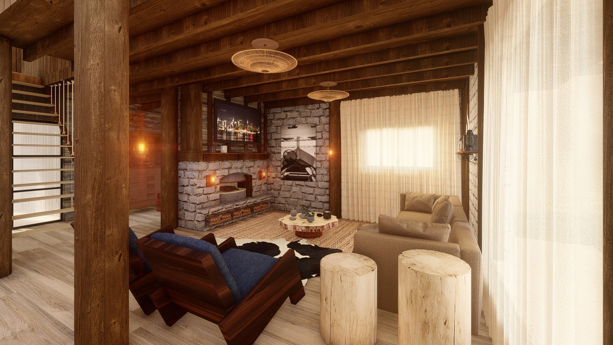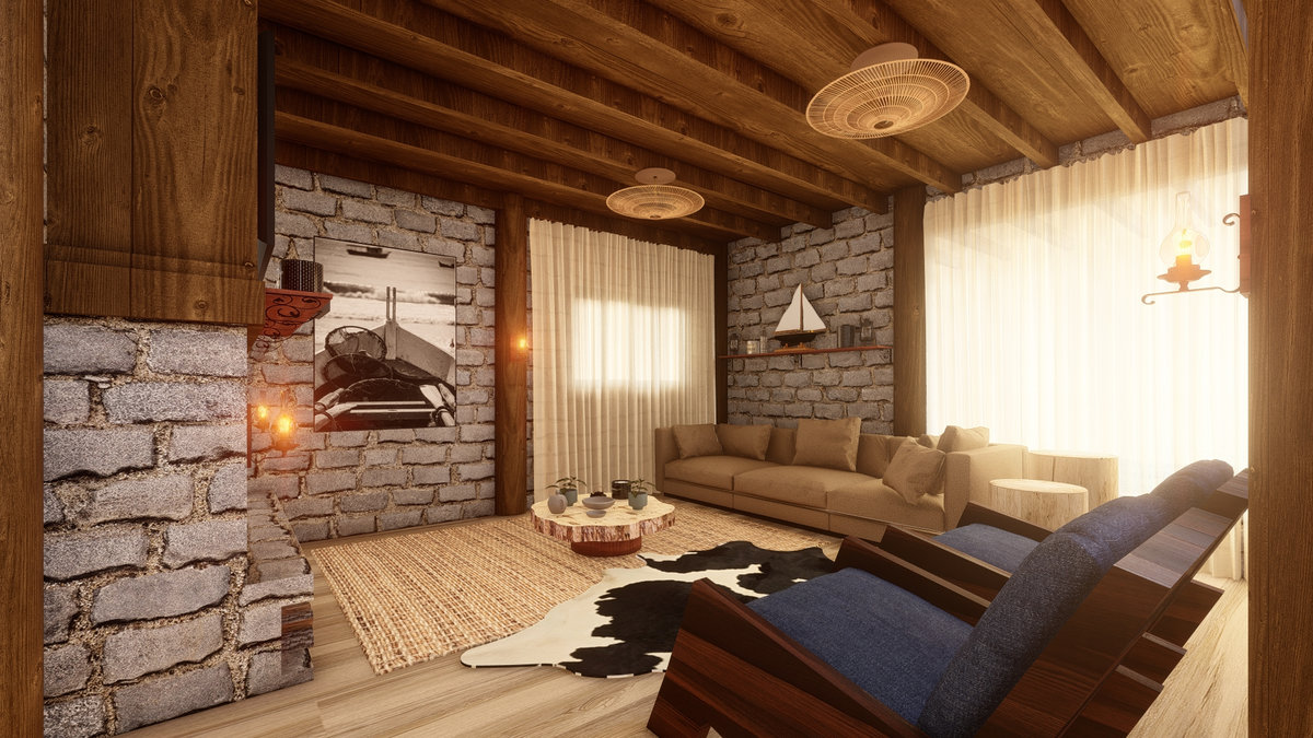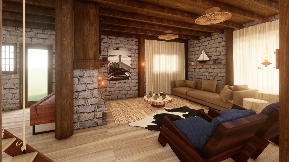 Arquitetura em pedra ferro e madeira aparente, com estrutura em vigas retangulares e forro contínuo em madeira entre elas. Uma composição que traduz rusticidade refinada, calor visual e a força dos materiais naturais em perfeita harmonia.