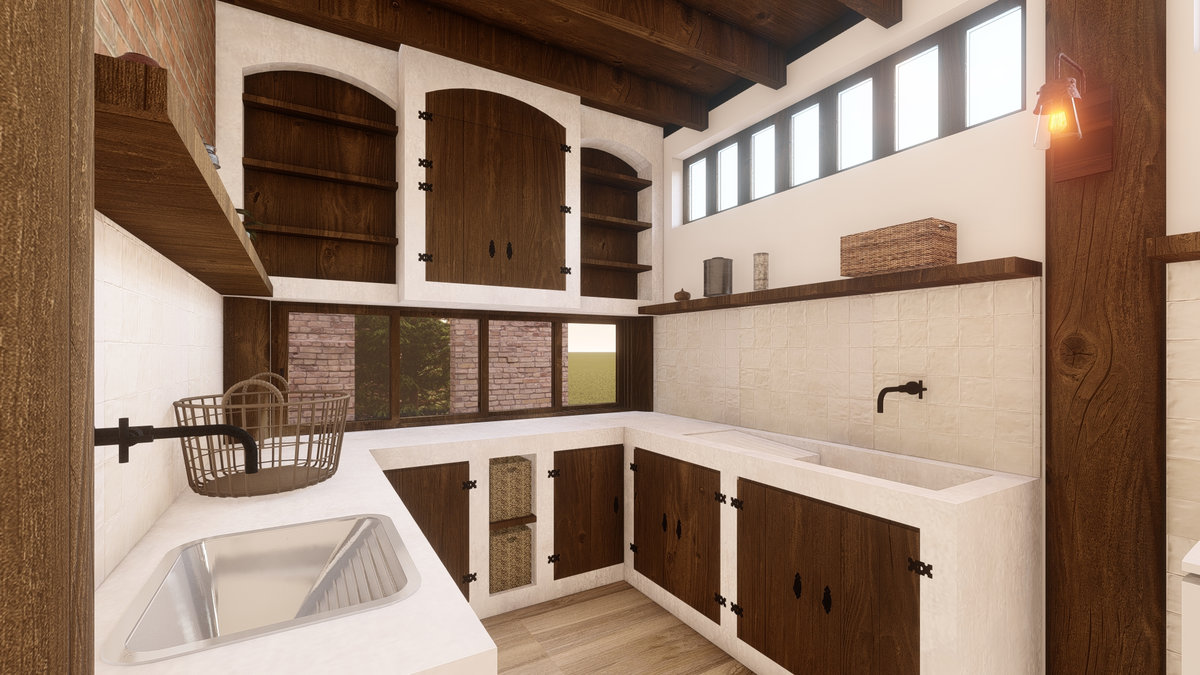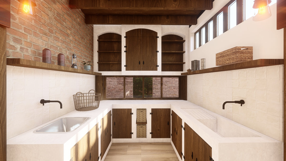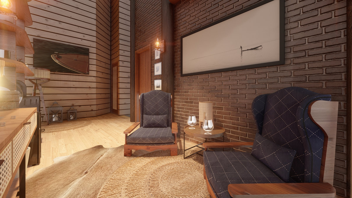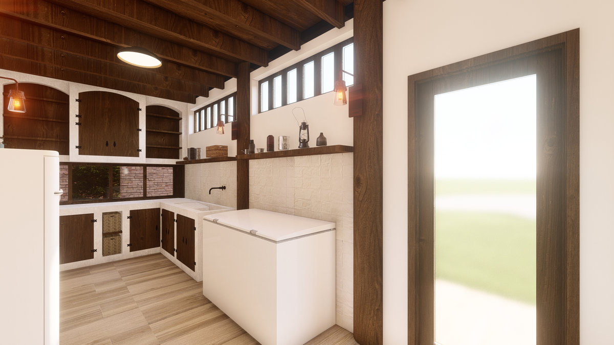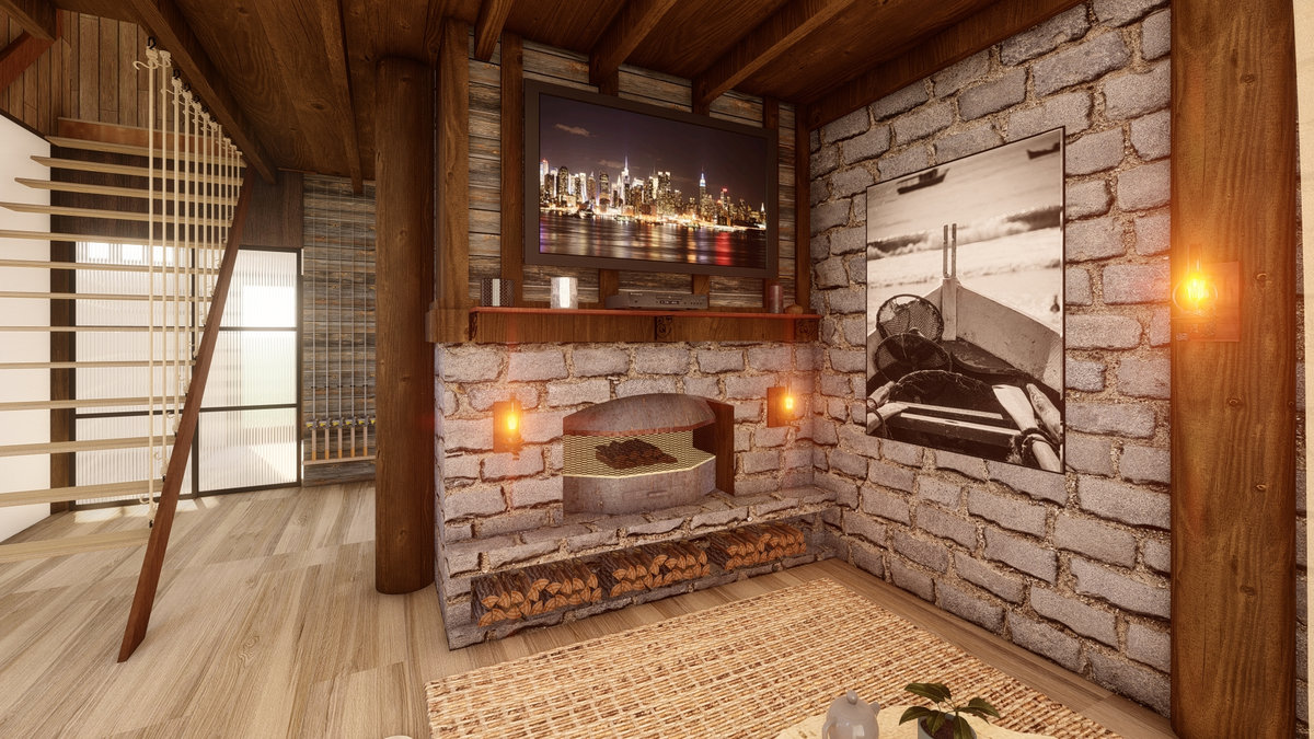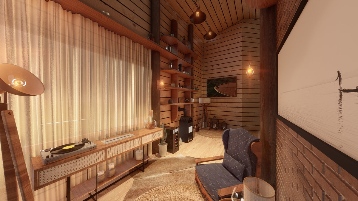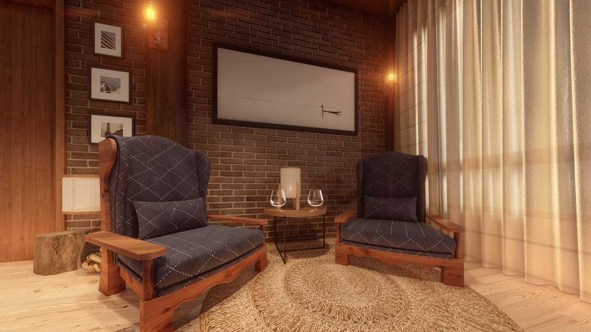 Arquitetura em pedra ferro e madeira aparente, com estrutura em vigas retangulares e forro contínuo em madeira entre elas. Uma composição que traduz rusticidade refinada, calor visual e a força dos materiais naturais em perfeita harmonia.